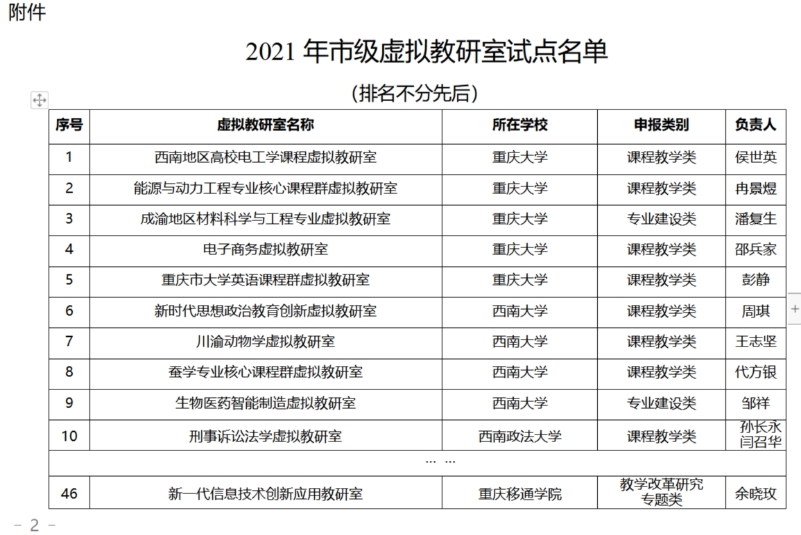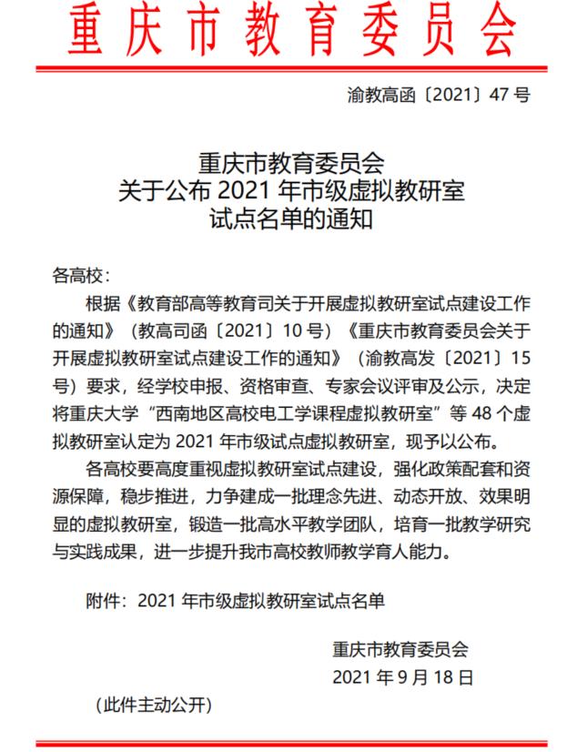 近日,重庆市教委下发《重庆市教育委员会关于公布2021年市级虚拟教研室试点名单的通知》(渝教高发〔2021〕47号),正式公布了2021年市级虚拟教研室试点名单。我校新一代信息技术创新应用教研室获批2021年重庆市虚拟教研室试点建设项目,这是我校基层教学组织建设的重大突破。