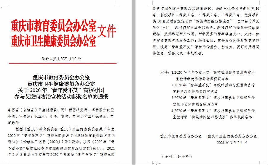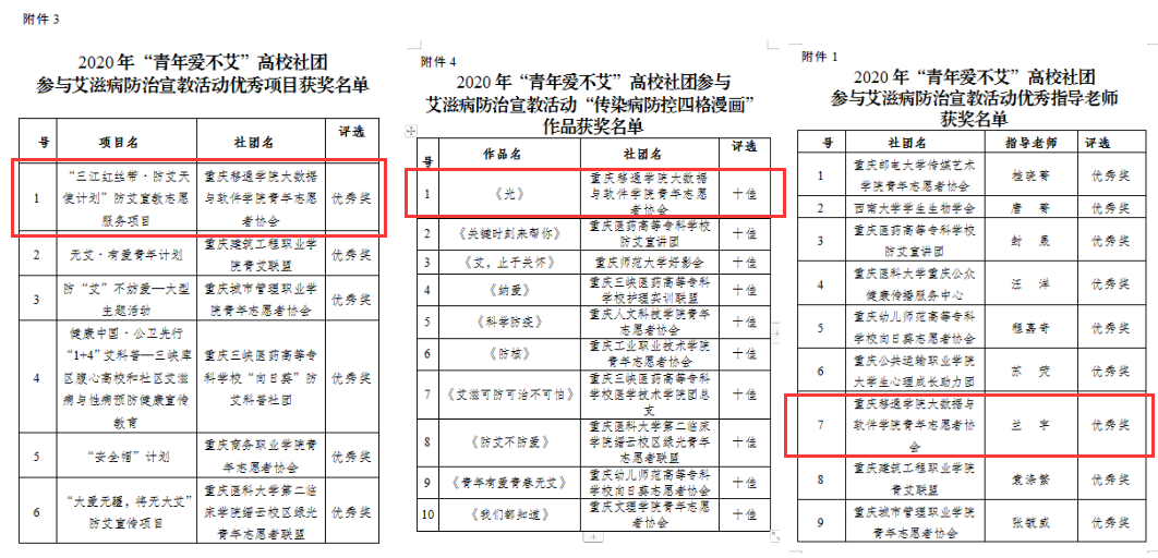 近日,重庆市教委、市卫健委对重庆市2020年第五届“青年爱不艾”高校社团参与艾滋病防治宣教活动进行通报表彰。我校大数据与软件学院“三江红丝带·防艾天使计划”项目荣获优秀奖,艺术传媒学院2020级动画专业杨羽菲同学作品《光》获得“传染病防控四格漫画”十佳作品,我校大数据与软件学院志愿服务板块指导老师兰宇荣获优秀指导老师荣誉称号。
