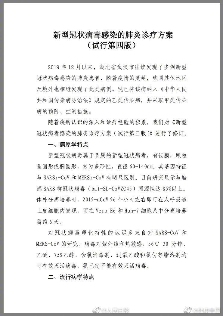 为进一步做好新型冠状病毒感染的肺炎病例诊断和医疗救治工作,国家卫生健康委员会组织专家对诊疗方案进行修订。1月27日,国家卫健委与国家中医药管理局公布《新型冠状病毒感染的肺炎诊疗方案(试行第四版)》。现转发至官网,望移通全体师生员工参照执行。