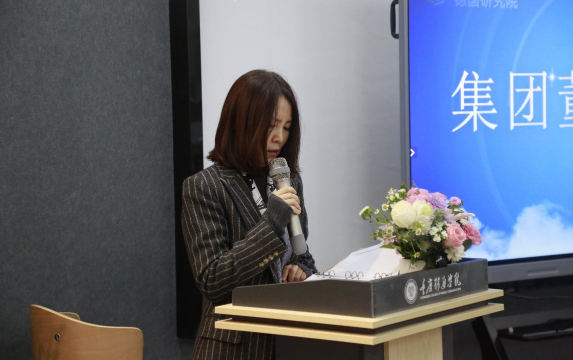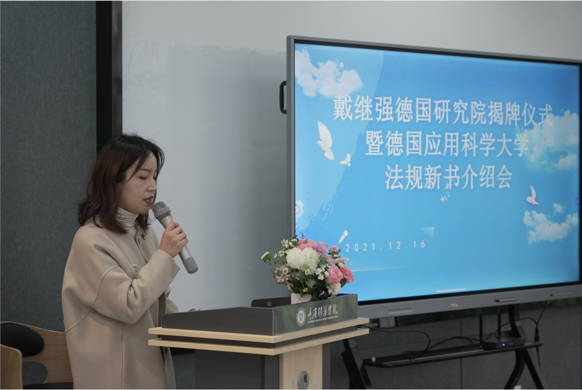 随后,由王苏燕女士致辞。她表示戴继强先生生前致力于中德教育交流,希望后来者能继承他的遗志。她同时感谢董事会、校领导、出版社及老师们的共同努力,将《德国高等教育暨应用科学大学法规汇编》完善并出版,弥补了戴继强先生留下的遗憾。
