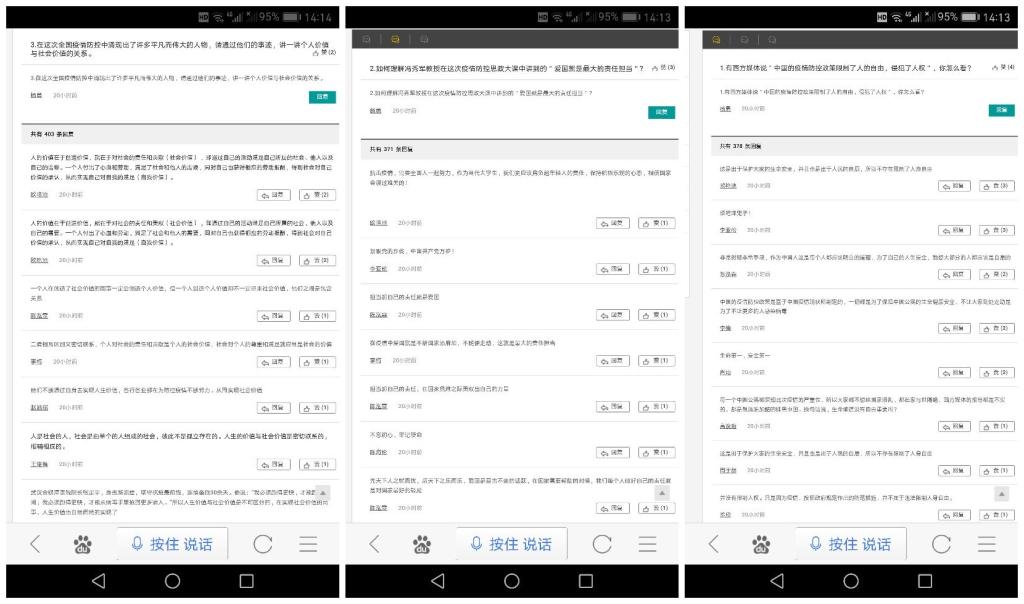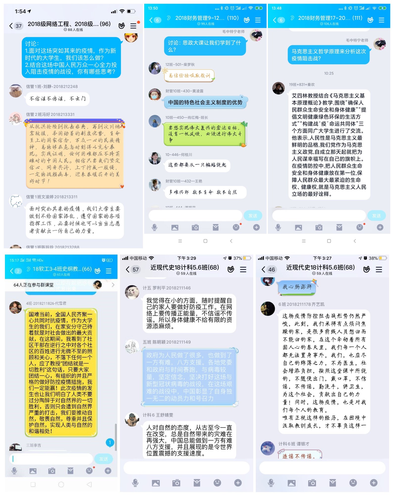 收看教学视频后,思政教学部的专任教师第一时间结合教学内容开展课堂讨论,深化对相关内容的认识,让学生们做到了学有所思、学有所获。依托直播课堂、QQ群、微信群以及重庆市在线开放平台围绕授课内容引导学生进行深入讨论,强化对课程内容的了解,师生们参与互动讨论十分踊跃,截至目前,共收到师生参与互动讨论的帖子6000余条,学生撰写学习感想800余篇。在互动中,老师们密切关注了学生学习动态,针对学生提出的问题,对学生进行释疑解惑,实时巩固了学习实效。