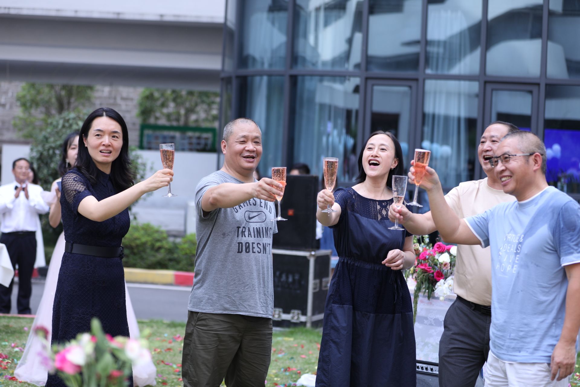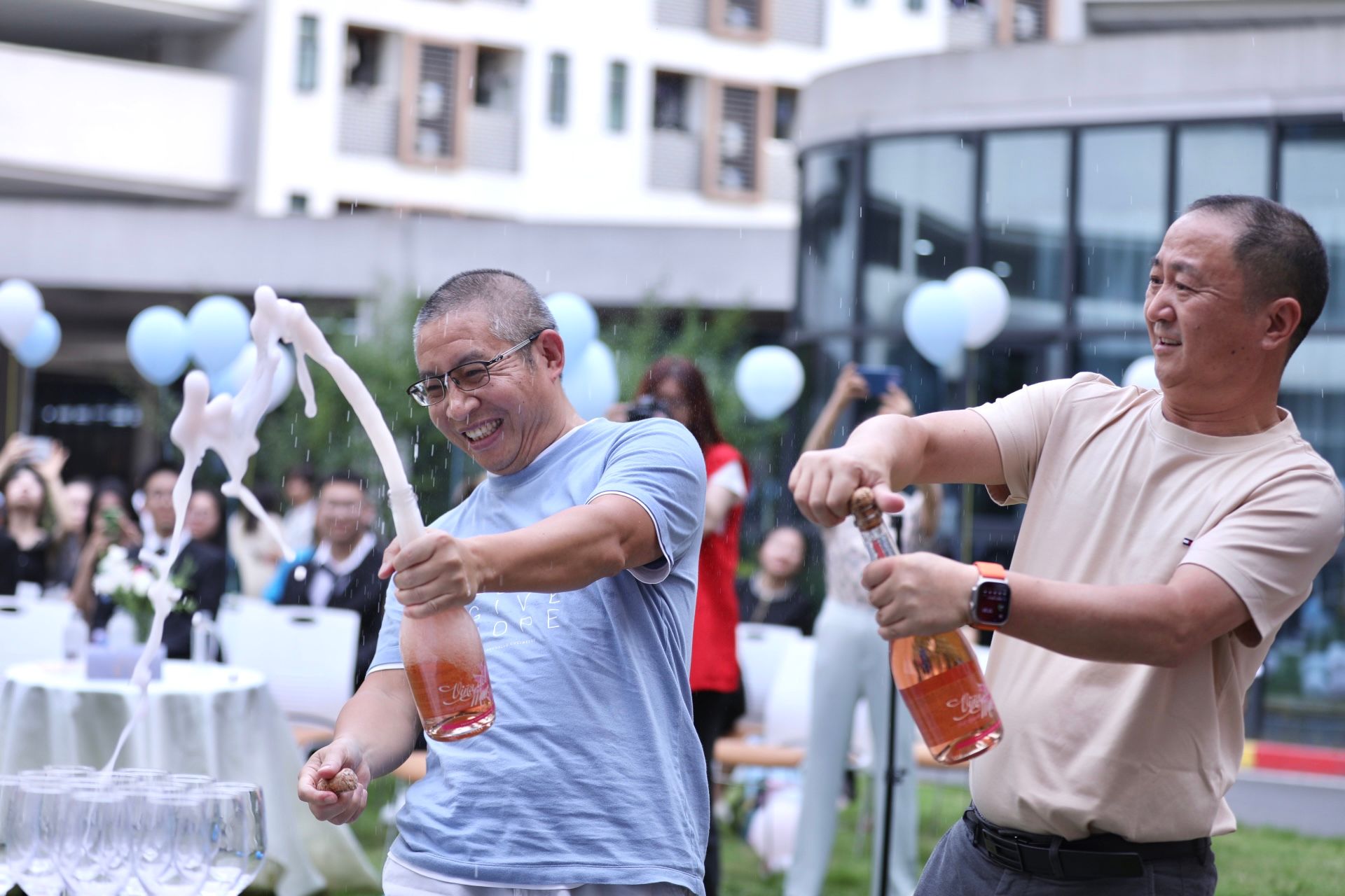 随着暖场音乐的响起,主持人步入舞台中央,隆重的气氛、热情的掌声、美味的食品都引发了大家强烈的参与热情。彭鸿斌博士和集团领导上台共倒香槟,大家共同举杯,宣布酒会开始。