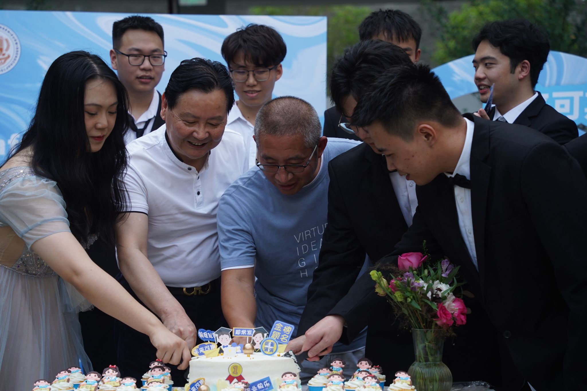 彭鸿斌博士和张德民教授与此次赴德同学共切蛋糕。随后,彭鸿斌博士作重要讲话,他指出,参与国际交流学习是同学们的宝贵机会,他鼓励我校学生珍惜留学机会,在国外除了好好学习之外,还要利用课外的时间,多游历,多体验。同时,彭董还对毕业生提出殷切期望,“我们的学生毕业之后,如何去创造价值?只要给社会创造了价值,社会一定会奖励你,要先想着把事情做好,去做贡献。当你们去就业的时候,不要想着这个工作能给你带来多少收入,要想着这个工作能不能让自己得到锻炼,自己能不能给这个岗位、给企业做出独特的贡献。”随后,学院教师、同学以及校乐团同学们为大家献上了精彩歌曲和语言节目表演。
