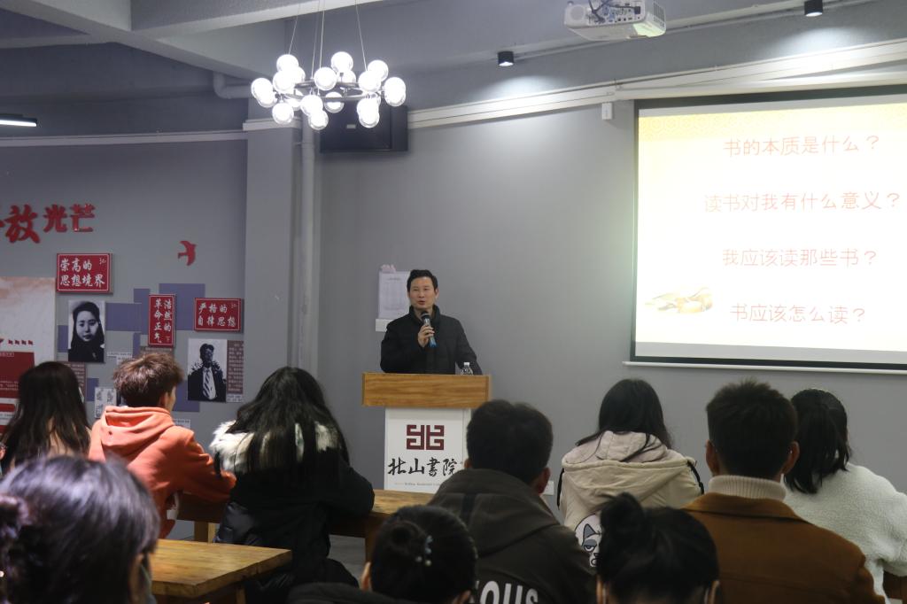 北山书院开展名誉院长精品课、“勤读书”学期总结分享报告会、“勤赏析”电影放映学期总结沙龙分享会、“勤动手”百匠工作室活动学期作品成果展4项活动。名誉院长王于飞教授分别在二楼会客厅为书院学子讲授“我们应该如何读书”主题精品课;在迎客厅为参与“勤读书”活动的学子推荐和分享了4本书籍;在舞蹈排练厅为百匠工作室活动学期表现优秀的学子颁发表彰证书并现场展示书法作品,该活动区域展示了书法、剪纸、泥塑、篆刻、扎染作品300余份,吸引了众多学生前来驻足和参观。