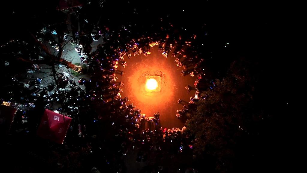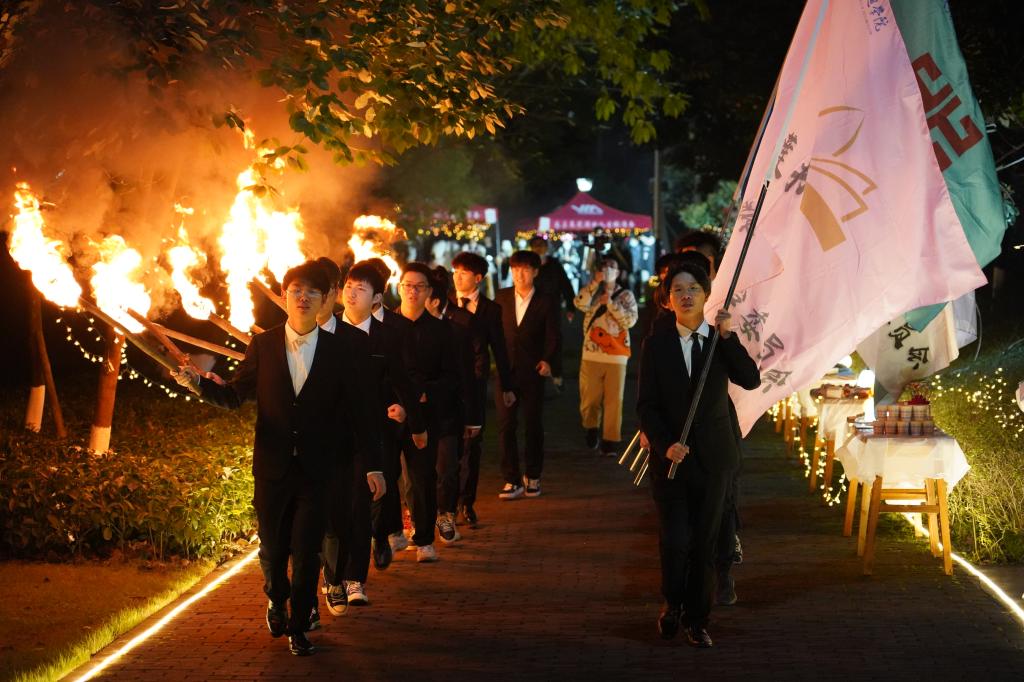 密集的击鼓声中,各书院旗帜与火炬队伍壮丽出场,舞动的旋律,是学院学子青春活力的彰显。在一片欢呼和呐喊声中,书院的主火炬燃起熊熊烈火,和将现场照的通明的篝火相互映衬,寓意火光相印,薪火相传。热情洋溢的氛围少不了音乐和舞蹈,千余名家人的篝火舞会,顺利拉开了序幕。