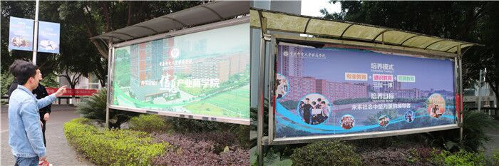 为了塑造良好的校园氛围,让全校师生在学习生活中耳濡目染,宣传新闻中心特地于开学前制作了学校“信息产业商学院”的办学定位,“专业教育、通识教育、完满教育”三位一体的人才培养模式,以及培养未来社会中坚阶层领导者的办学目标的道旗、海报、广告牌等,并悬挂、张贴在校门口,各主干道、教室、宿舍、电梯内等校园显眼处,供全校师生学习、了解、践行,做到入脑入心。