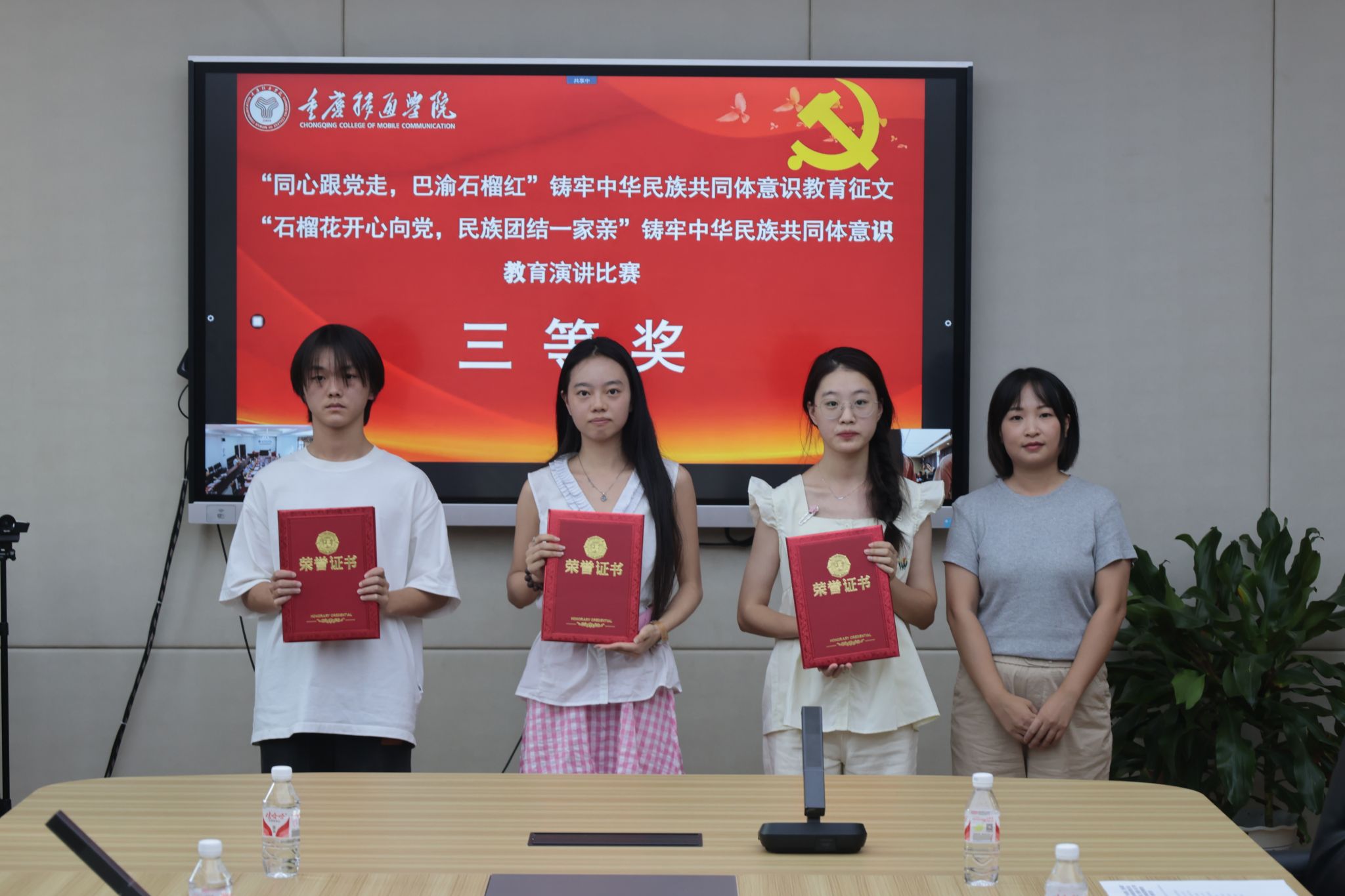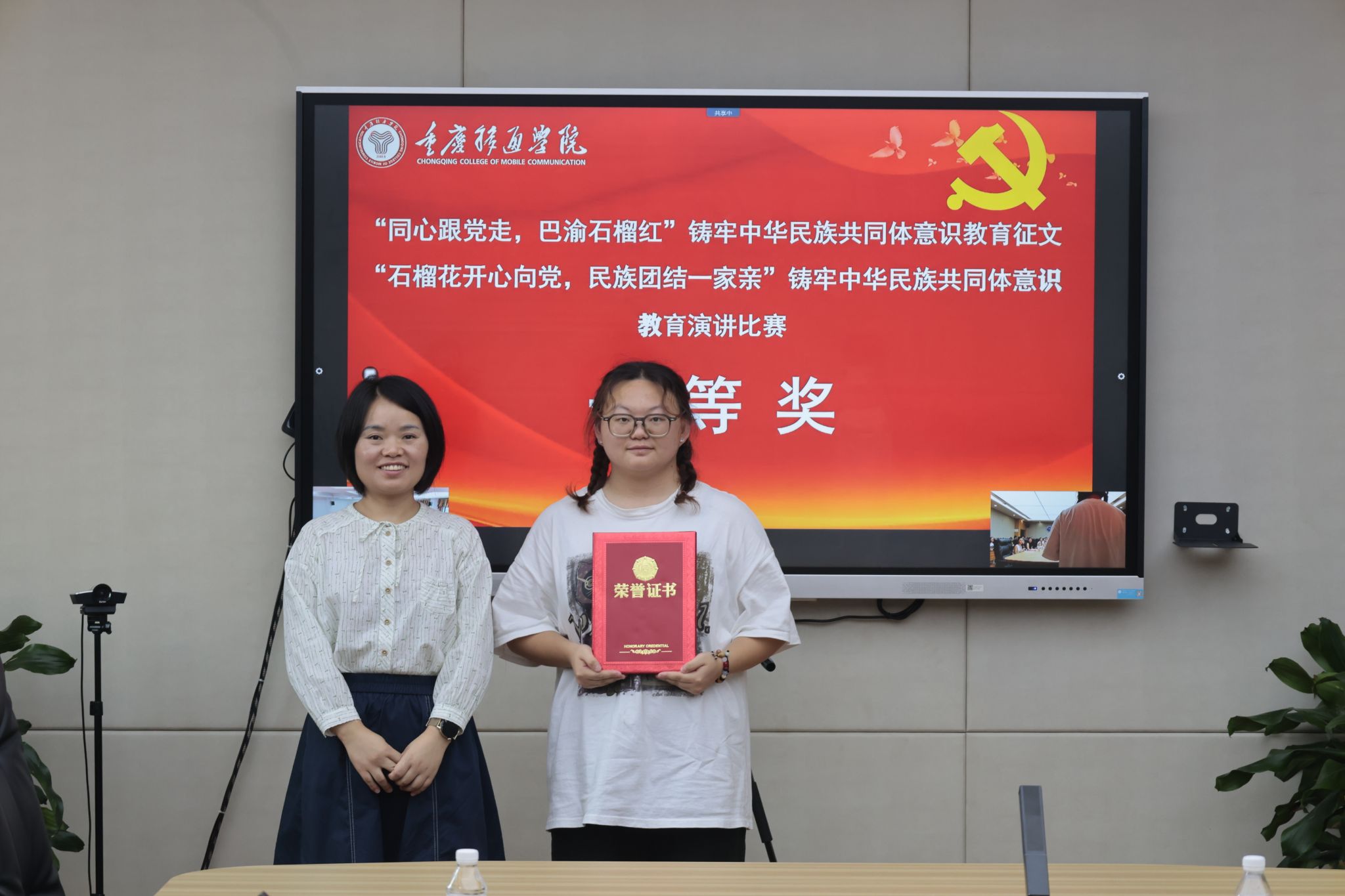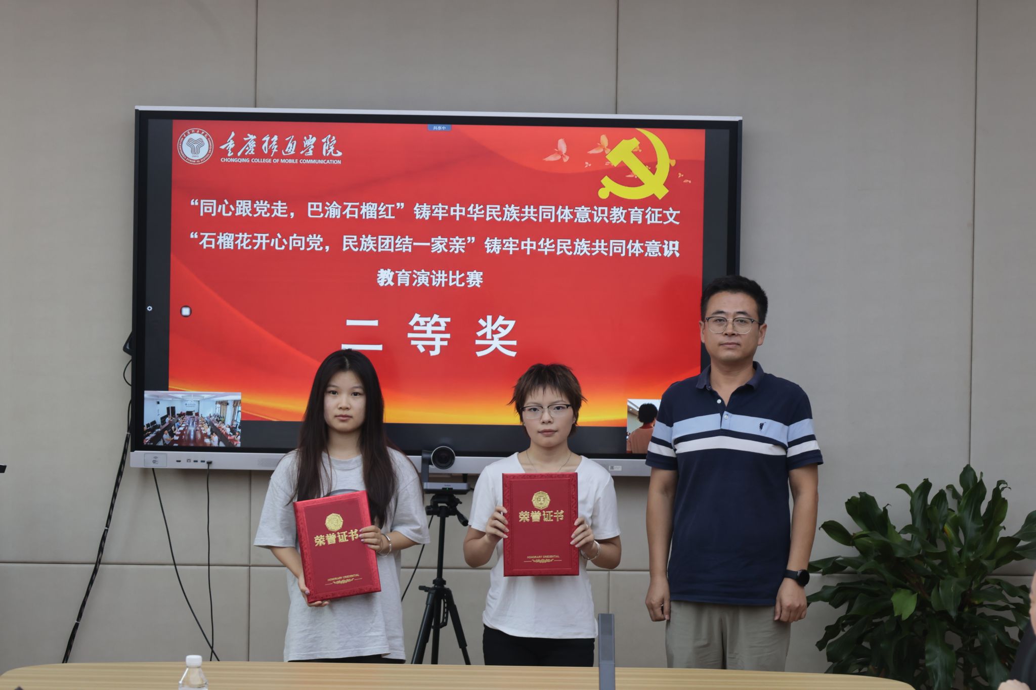 统战部部长秦代辉、綦江校区党政综合办副主任曹瑞峰为付盈盈等五名二等奖获奖者颁奖。