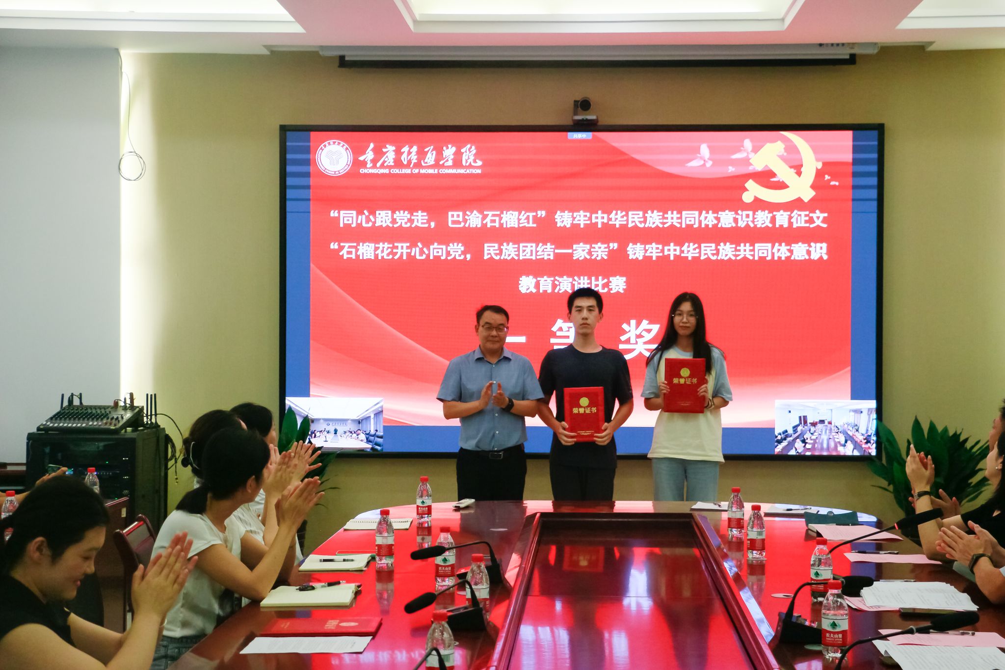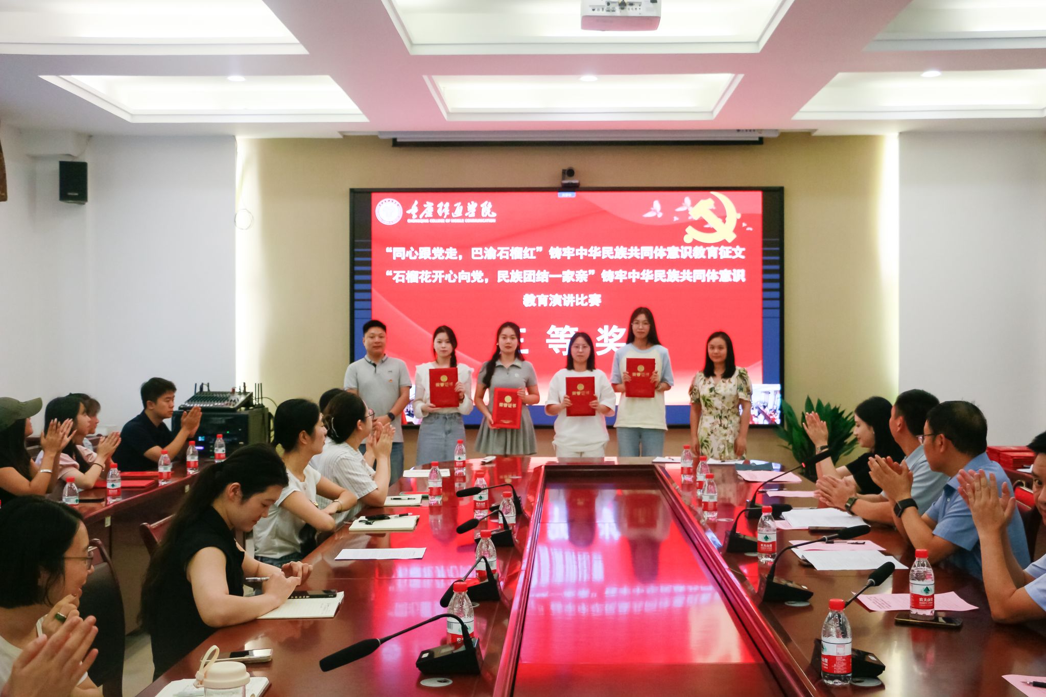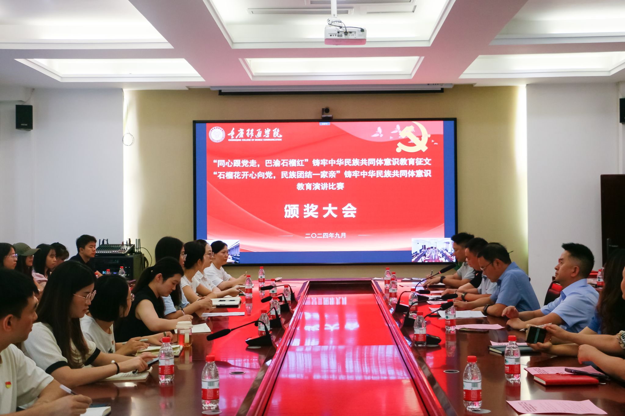 为深入贯彻习近平总书记关于加强和改进民族工作的重要思想,并进一步加强了我校中华民族共同体意识,9月27日下午,我校双校区分别在107会议室、图书馆414室同步开展“同心跟党走,巴渝石榴红”铸牢中华民族共同体意识教育征文活动及“石榴花开心向党,民族团结一家亲”铸牢中华民族共同体意识教育演讲比赛的颁奖仪式。我校党委书记何先刚,校长助理谢银平,统战部部长秦代辉,各职能部门负责人、统战团体及民主党派代表教师、基层党组织统战委员、评委老师、优秀指导教师代表、获奖学生代表出席本次颁奖仪式。