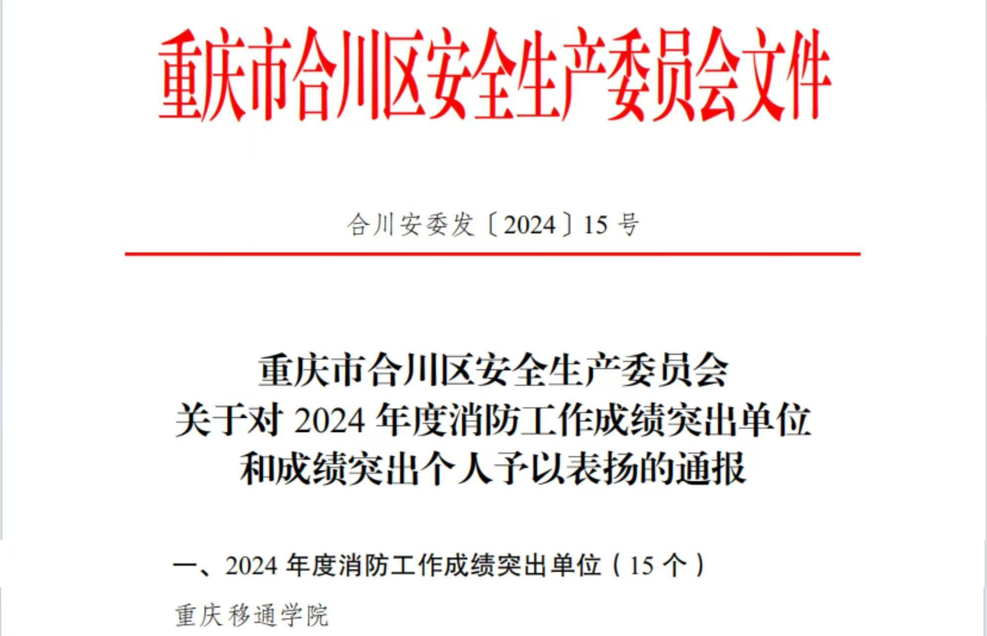 12月16日,重庆市合川区安全生产委员会下发了《关于对2024年度消防工作成绩突出单位和成绩突出个人予以表扬的通报》,通报表扬重庆移通学院等15个合川区2024年度消防工作成绩突出单位,我校是通报表扬单位中唯一一所高校。