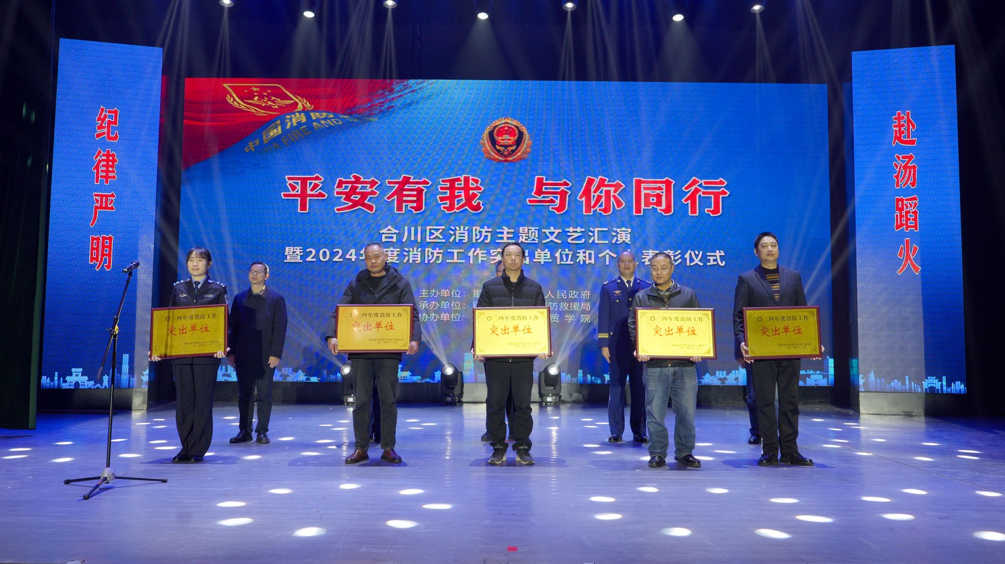 12月18日,在“平安有我 与你同行”合川区消防主题文艺汇演暨2024年度消防工作突出单位和个人表彰仪式上,校长助理尹浩亮代表学校上台接受授牌。