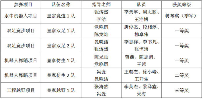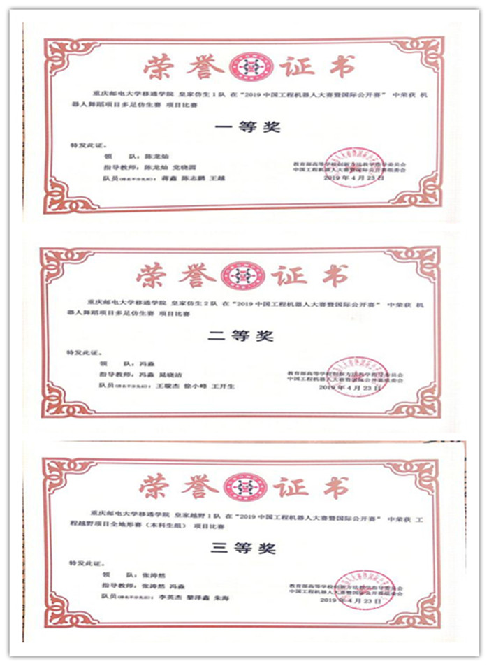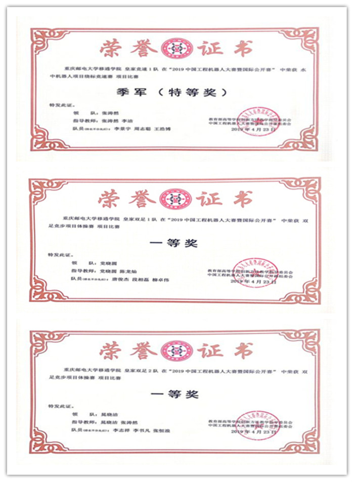 4月21日至24日,2019中国工程机器人大赛暨国际公开赛、2019中国人工智能技术与产业发展高峰论坛在广东省韶关学院成功举办。来自全国301所高校的1726支代表队(约8000位师生)参加比赛。在智能工程学院党晓圆、李洁、张涛然、陈龙灿、晁晓洁、冯淼老师的指导下,6支队伍经过四天的激烈角逐,斩获特等奖(季军)1项、一等奖3项、二等奖1项、三等奖1项。尤其是在水中机器人项目中,我校学子用时180秒,绕标12圈,喜获特等奖(季军)。实现了我校在机器人专业赛项中零奖项的突破。