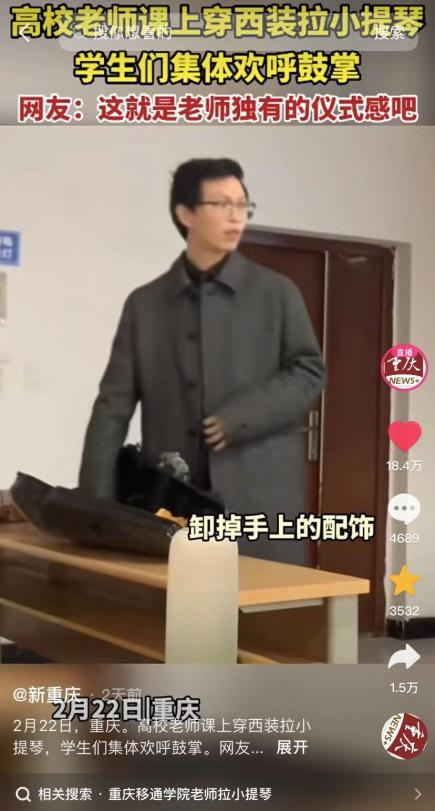 近日,一则“高校老师课上穿西装拉小提琴”的视频走红网络。这位老师是谁?这到底是一门什么课?为什么会在课上拉小提琴?2月25日,华龙网-新重庆客户端记者了解到,视频中主人公是重庆移通学院通识教学部教师石权,当天他正在为学生们上本学期的第一堂选修课——音乐剧。