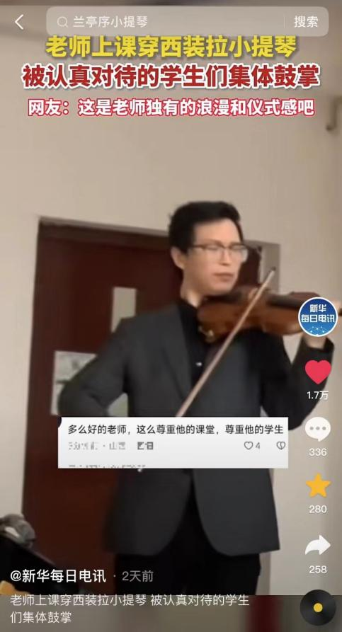 据了解,这并非石权首次走红网络,早在去年10月中旬,便有学生拍摄关于他在课上拉小提琴的视频走红网络。不少学生表示:“石权老师的课,很抢手。”本次视频拍摄学生邓舒潇向记者回忆,当时在课上,石权老师问大家是否想听现场演奏,课上气氛一下就活跃了起来。“看到他脱下外套,里面穿着西装那一刻,就感觉很正式,所以就拍了下来。”邓舒潇说。