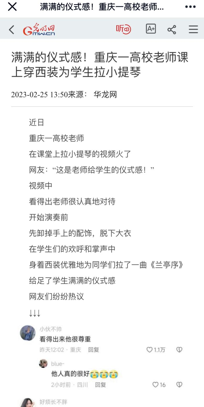 华龙网-新重庆客户端讯(记者 秦思思)课上穿西装摘腕表,用小提琴演奏周杰伦的《兰亭序》,这样有仪式感又浪漫的大学课堂你感受过吗?