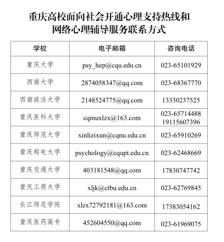 2.重庆大学、西南大学、西南政法大学、重庆医科大学、重庆师范大学、重庆邮电大学、重庆交通大学、重庆工商大学、长江师范学院、重庆医药高等专科学校等10所全市高校心理咨询与服务示范中心,以网络辅导服务为主、热线电话咨询为辅面向全市广大师生开展心理咨询服务。
