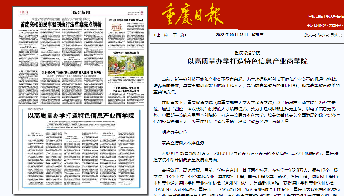 6月22日,《重庆日报》在综合新闻版以《以高质量办学打造特色信息产业商学院》为题,报道我校特色育人模式。该篇报道从“明确办学定位、创新人才培养模式、塑造特色教育品牌”三个方面,全方位展现我校“四位一体双院制”人才培养模式,肯定了我校特色育人成果,进一步塑造了学校品牌形象,提升了学校社会影响力与美誉度。