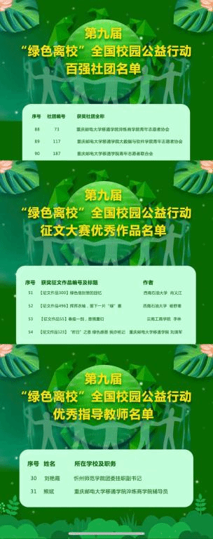 9月15日,由中国环境报主办的第九届“绿色离校·绿色感恩”全国校园公益行动评选活动完满落幕,我校青年志愿者联合会、淬炼商学院青协、大数据与软件学院青协从335队伍中脱颖而出,被评为全国优秀社团,获全国“百强社团”称号,其中,大数据与软件学院刘演军同学荣获优秀征文作品奖、淬炼·国际商学院熊斌荣获优秀指导老师奖。