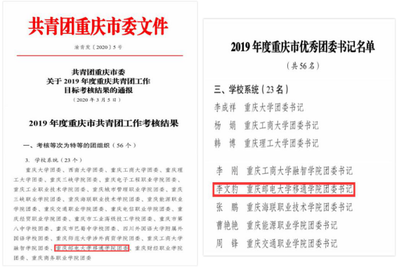 2019年,我校团委在校党委、团市委的坚强领导和亲切关怀下,把各项共青团工作落到实处,取得了新的进步和肯定,在2019年度重庆共青团工作目标考核中荣获“特等奖”(全市共评选23个),在重庆65所高校中脱颖而出,这也是继2018年5月我校团委荣获“重庆市五四红旗团委”后的又一殊荣。同时,校团委书记李文豹同志荣获“2019 年度重庆市优秀团委书记”称号。