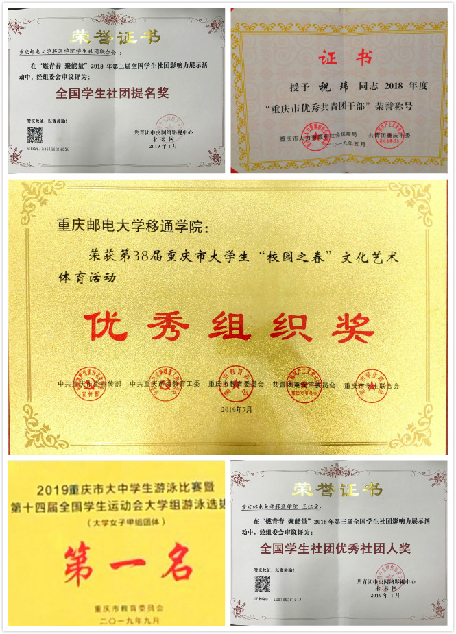2019年度,校团委先后获得共青团中央“全国最热公益校园”、重庆市第38届“校园之春”优秀组织奖和“志愿青春”智博会志愿服务技能大赛一等奖、重庆市大中学生游泳比赛男子组团体总分第一名等20余项荣誉;祝玮同志获重庆市优秀团干部称号、学生社团联合会荣获“全国学生社团提名奖“、6个学生社团荣获团中央“最具影响力社团”荣誉称号;王江文等同学荣获团中央“全国学生社团优秀社团人”等荣誉称号;原创剧目《错轨》作为“向祖国献礼——重庆市庆祝新中国成立70周年优秀原创剧目展演”参演剧目之一,在重庆国泰艺术中心舞台上演。
