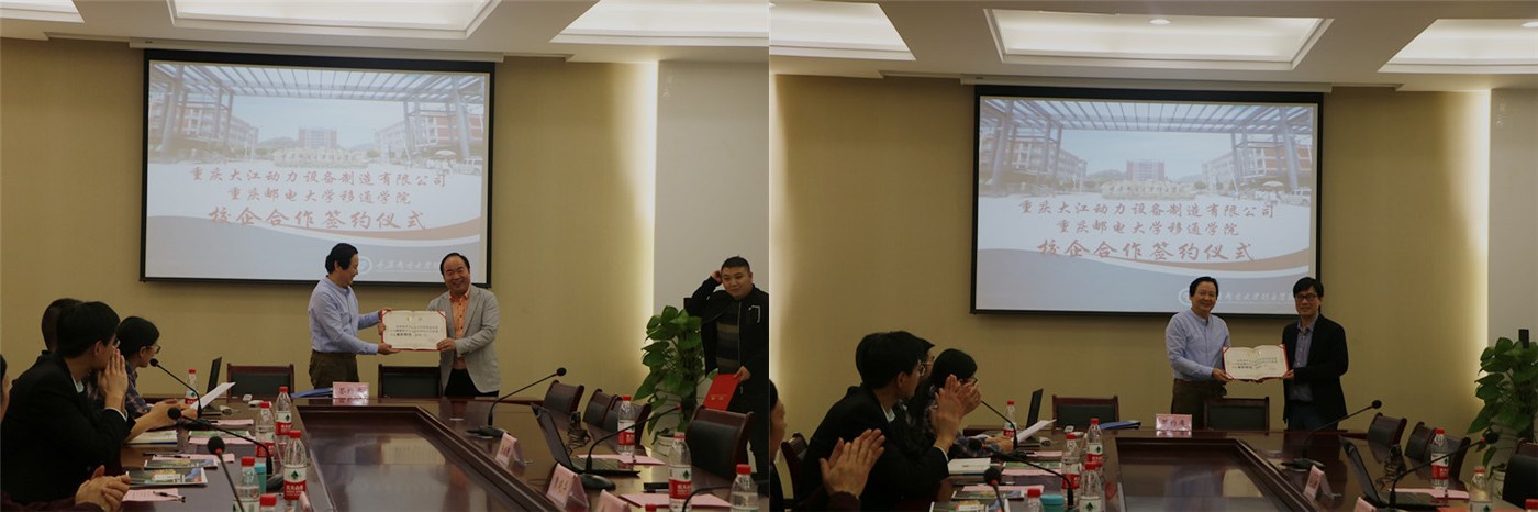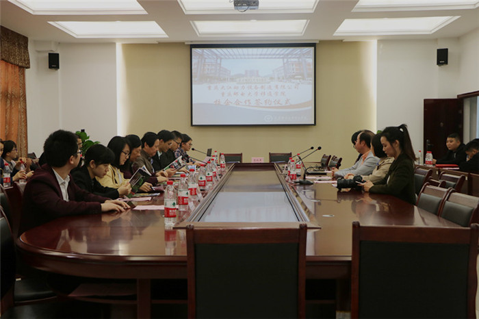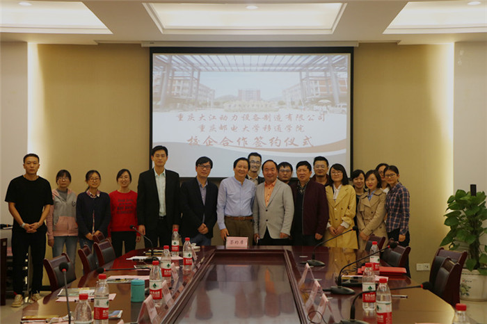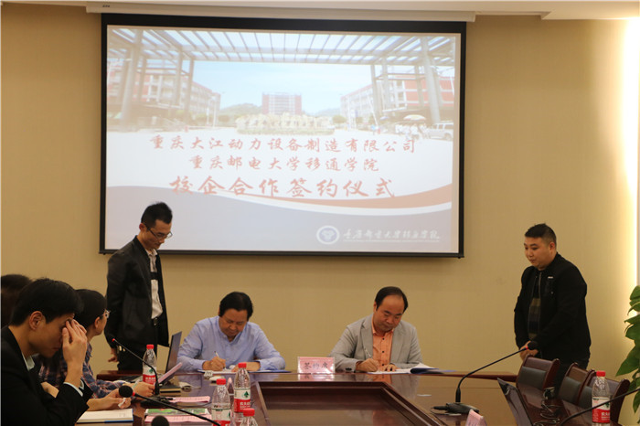 10月29日下午3点,重庆邮电大学移通学院与重庆大江动力设备制造有限公司在行政楼107会议室举行了校企合作签约仪式。校长张德民教授、校长助理周伟老师、重庆大江动力设备制造有限公司总经理熊晓华、研究院院长冉启舸、人事行政主管余兰,智能工程学院副院长党晓圆和相关老师出席签约仪式。签约仪式由李巧老师主持。
