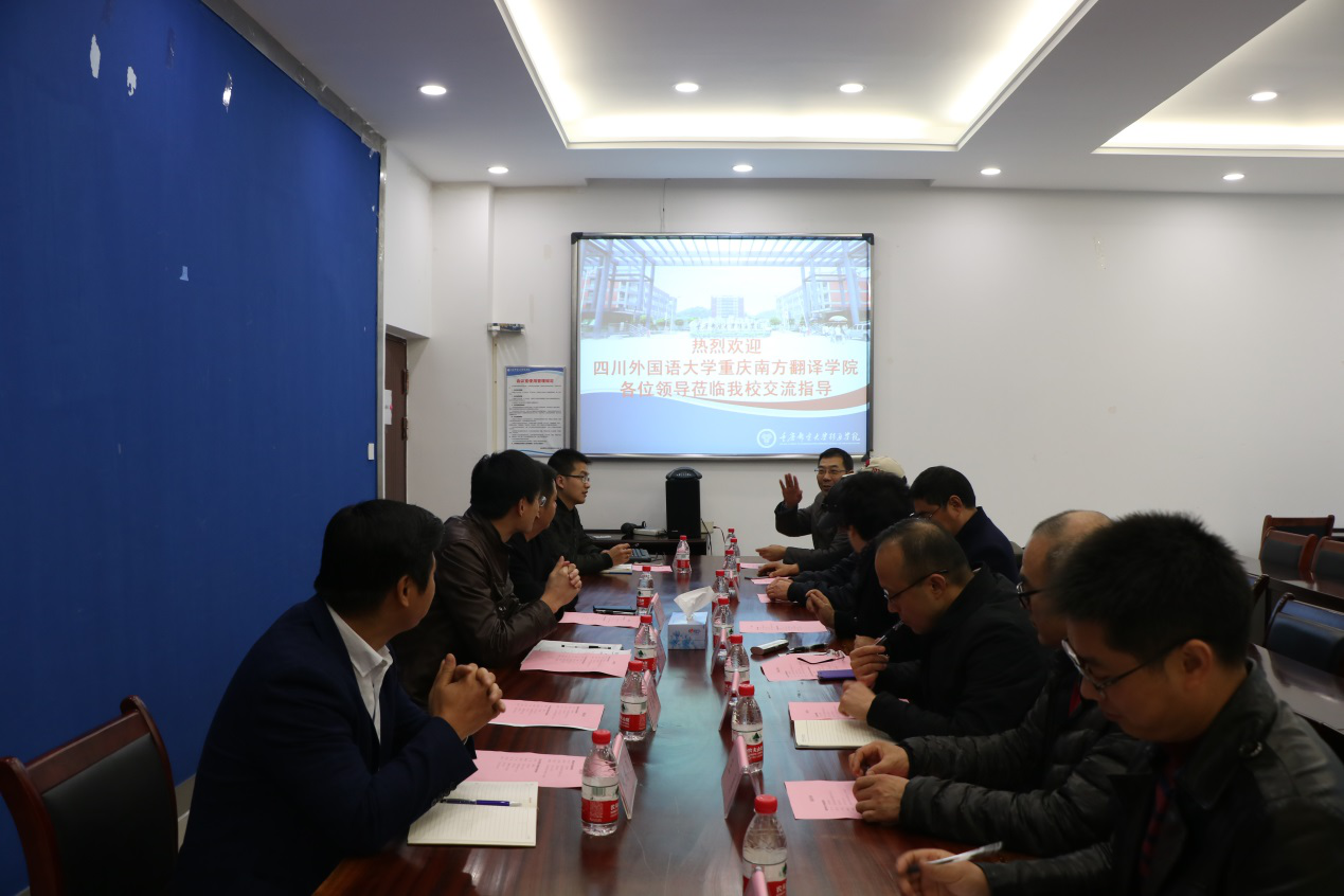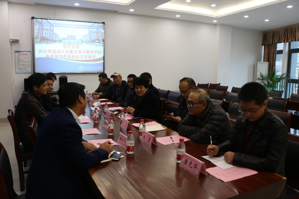 下午,两校交流座谈会在行政楼417会议室召开,四川外国语大学重庆南方翻译学院副校长段美芬,校长助理王青,就业办公室主任雷嘹亮,现代教育技术中心主任刘国玲,资产处处长王勇,后勤服务公司总经理周毅,学生处处长孙华余,招生办公室副主任唐先华;我校校长助理周伟,就业创业指导与服务中心主任陈仲华,招生办公室主任张成川,就业创业指导与服务中心主任助理杨德龙参加会议。