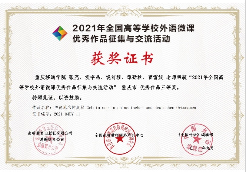 近日,由中德应用技术学院张亮老师牵头制作提交的微课视频《中德地名的奥秘(Geheimnisse in chinesischen und deutschen Ortsnamen)》在2021年全国高等学校外语微课优秀作品征集与交流活动中荣获省级优秀作品三等奖。这既是团队成员的荣誉,也再次证明了我院在教育教学改革、教学手段更新,尤其是信息化教学中所取得的进步。
