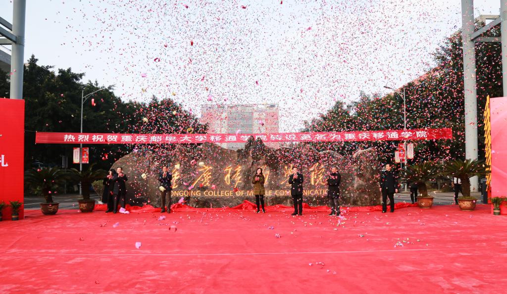 红绸缓缓落下,“重庆移通学院”六个金色大字映入眼帘,瞬时彩带腾飞、五彩缤纷,在场各领导嘉宾及师生员工共同欢呼见证了这振奋人心的时刻!