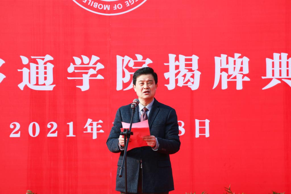 1月18日上午,我校于南校区大门隆重举行“重庆移通学院” 揭牌仪式。合川区教委主任朱显贵,合川区教委高教科科长龚国强,我校董事李茂军、王征、周德才,校长张德民,校党委书记苏开荣,翔美教育人力资源总监彭光明等领导出席仪式并为我校揭牌。社会各界嘉宾、我校教职工、师生代表及新闻媒体等共计200余人共同见证学校发展史上这个具有里程碑意义的历史时刻。仪式由校党委书记苏开荣主持。