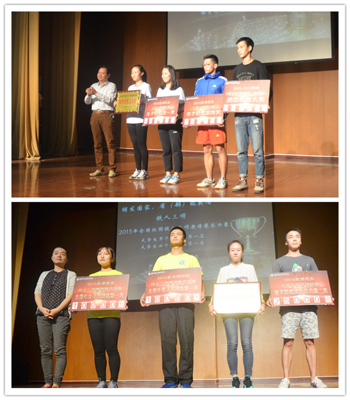 市级英雄——大会最后一个奖项。在过去的一学年,我校运动员凭借自己的努力在重庆市获得多个奖项,其中,在2015年全国校园铁人三项比赛中我校运动员取得了男、女子大学生组团体第一的优异成绩。每一份荣誉背后充满无数的汗水和泪水,他们用自己的努力告诉我们拼搏的意义,我们为他们自豪。