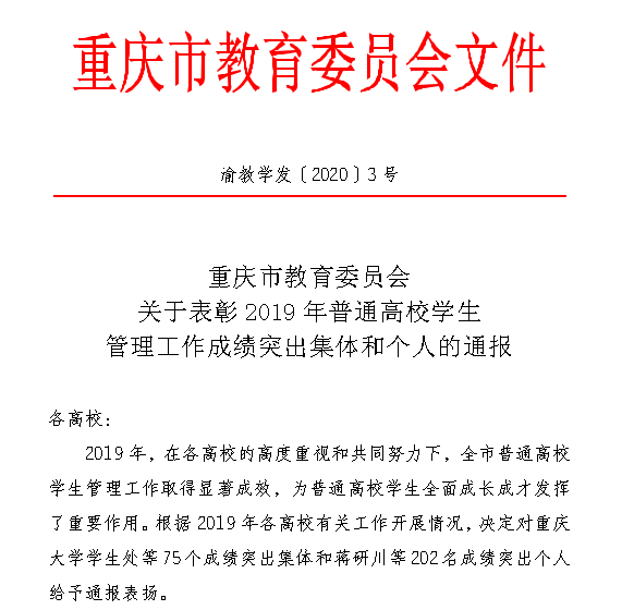 近日,重庆市教育委员会公布重庆市普通高校2019年“学生管理工作成绩突出集体和个人”通报表扬名单,全市75所高校突出集体和202名突出个人获此殊荣。我校学生处荣获“学生日常管理工作成绩突出集体”,就业创业指导与服务中心荣获“毕业生就业创业工作成绩突出集体”,陈帅、王万福荣获“学生日常管理工作成绩突出个人”,陈明兰荣获“学籍管理工作成绩突出个人”,车丽芳荣获“毕业生就业创业工作成绩突出个人”。我校总奖项数量在重庆市独立学院中名列第一,就业创业指导与服务中心是独立学院中唯一获得该项成绩突出集体称号部门。