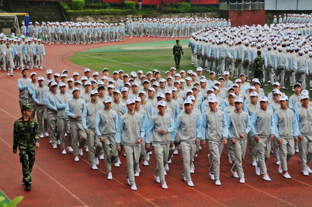 分列式在雄壮激昂的《中国人民解放军进行曲》中拉开帷幕,各个连队依次走向主席台,向主席台的领导展示这半月来的蜕变。他们抬头挺胸、步伐沉稳,队列整齐,气势如虹,踩着音乐的节点,口号震天,在教官的有序指挥下,迈着矫健、整齐划一的步伐通过主席台接受检阅。
