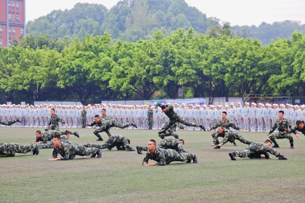 随后,军体拳、匕首操、教官方阵、舞蹈方阵轮番上场,为现场的观众们带来了一场激情洋溢的汇报表演。铿锵有力的叫喊、整齐划一的出拳,一招一式都充分展现了我校大学生的精神风貌以及军训的丰硕成果。舞蹈方阵别出心裁的在表演最后摆出“二〇一八移通”的字样,用他们的方式向学校献礼。表演气势磅礴、振奋人心,新生们用自己的青春风采和高昂的士气赢得了在场师生热烈的掌声。