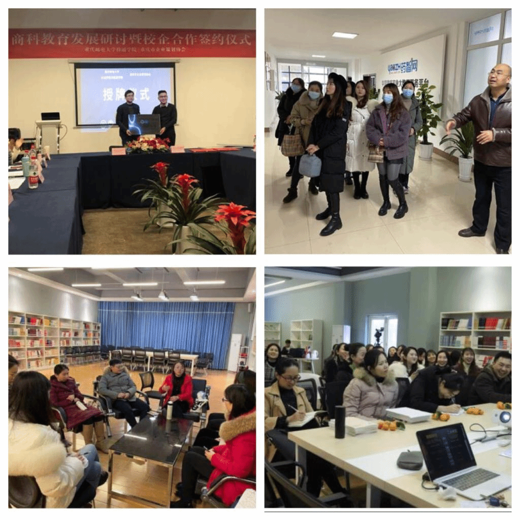 在探索和构建新商科教学模式的过程中,我们以学生的发展为中心,以我校的定位为导向,积极地与书院、与专业、与通识的相关老师、与企业管理人员进行交流和访谈,探索融合点和融合方式。我们与别都书院共建青蓝品牌与战略管理研究工作室,通过学习在学院,实践讨论在书院的双院育人机制,并展开了初步的合作。我们与数字经济与信息管理学院展开了专业课程与商科课程的融合教学问题,围绕如何更好地培养复合型的信息化人才进行课程群和课程内容的探讨,并达成后期深度合作的方案;我们邀请科幻中心的张凡老师进入到商学院,探讨想象力与商科之间的融合问题;我们的商道、问道大讲堂也持续开展了2年多,邀请了信息产业的商业大咖到我校开展讲座,也有不错的效果;我们邀请初创企业的高管进入商学院,谈他们发展的问题;走进重庆企业策划协会、康州大数据有限公司谈合作。