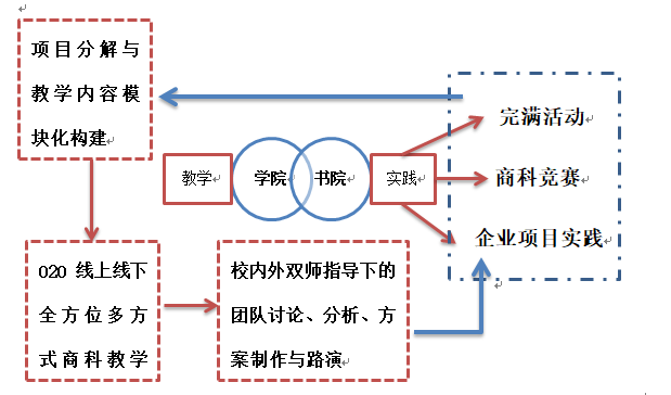 在多年教学的探索和经验汇总后,我们构建出了全校商科教学新模式的雏形。大胆地在教学内容、教学方式、教学评价、教学成果方面进行新的尝试和改革。如图所示: