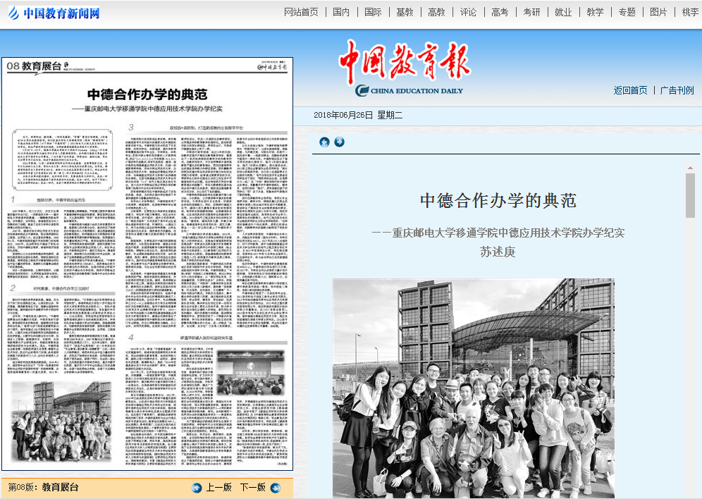 6月26日,中国教育报以《中德合作办学的典范——重庆邮电大学移通学院中德应用技术学院办学纪实》为题,通过“放眼世界,中德学院应运而生”“时代需要,中德合作办学正当其时”“双校园+双院制,打造更成熟的出国留学平台”“移通学院驶入国际化进程快车道”4个板块,在第8版“教育展台”栏目整版报道我校中德应用技术学院。