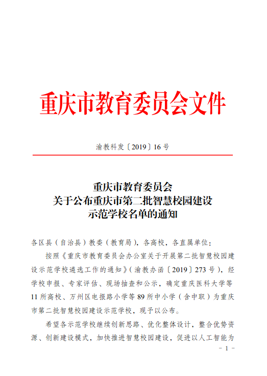 近日,按照《重庆市教育委员会办公室关于开展第二批智慧校园建设示范学校遴选工作的通知》(渝教办函〔2019〕273号)要求,经自主申报、专家评审、现场核查,我校成功入选“第二批智慧校园建设示范学校”,这是我校信息化工作在今年五月获评“重庆市教育信息化优秀试点单位”后再次获得市级荣誉。