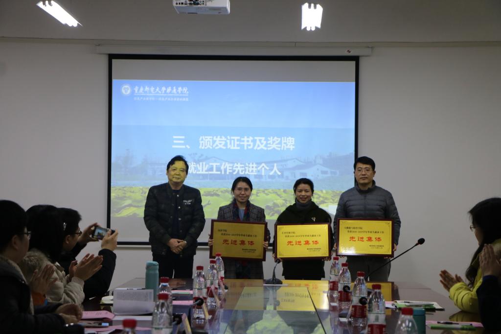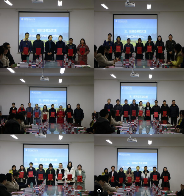 随后,校长助理孙玺为重庆市就业创业指导专家库陈仲华、杨德龙、李晓燕、郭淼、李军5位老师颁发聘书;校长助理王永周为曾国庆等3名高级创新创业导师、李晓燕等23名创新创业导师颁发2019-2020学年学校创新创业导师库成员聘书;校长助理刘枚为第二届就业创业课程大赛李邓金等16名获奖教师颁发荣誉证书;校长张德民为任瑞娟等8名教师颁发2018-2019学年就业工作先进个人证书,为艺术传媒学院、大数据与软件学院、远景学院颁发2018-2019学年就业工作先进集体奖牌。