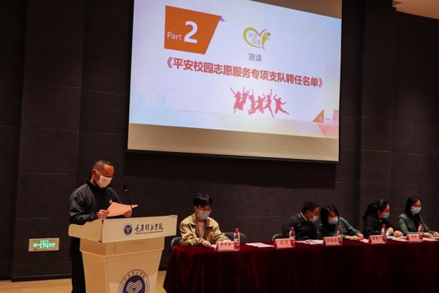 4月15日下午,平安校园志愿服务专项支队成立授旗仪式暨聘任大会在六度空间·大学生发展中心105℃学术报告厅开展,整场活动在营地教育中心郭帅老师的主持下顺利举行。校长助理尹浩亮老师、团委副书记谢银平老师、保卫处处长彭洪老师、平安校园志愿服务专项支队指导老师,及支队志愿者代表参与活动。
