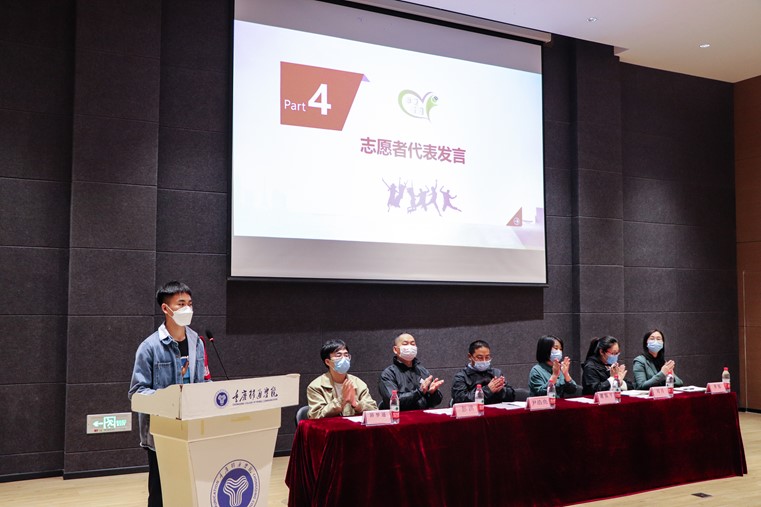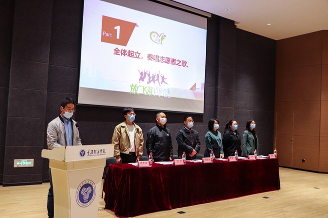“我们是青年志愿者,用真情迎接美好明天;我们是青年志愿者,用热血来书写春秋。”一首青年志愿者之歌拉开了平安校园志愿服务专项支队成立仪式的序幕,为整个仪式营造了浓厚的志愿氛围。在仪式上,保卫处处长彭洪宣读《平安校园志愿者服务支队聘任名单》,校团委副书记谢银平老师为支队志愿者代表颁发聘书,一份名单、一份聘书,传递的不仅仅是荣誉,更是责任与使命。就如仪式上志愿者代表曾小海同学发言一样,他们接过这根志愿接力棒,不仅仅是完成任务,更多是彰显我校青年学子的担当,他们会将“初心”写在行动上,将“使命”落在岗位上,为我校志愿服务奉献自己的青年青春的力量。