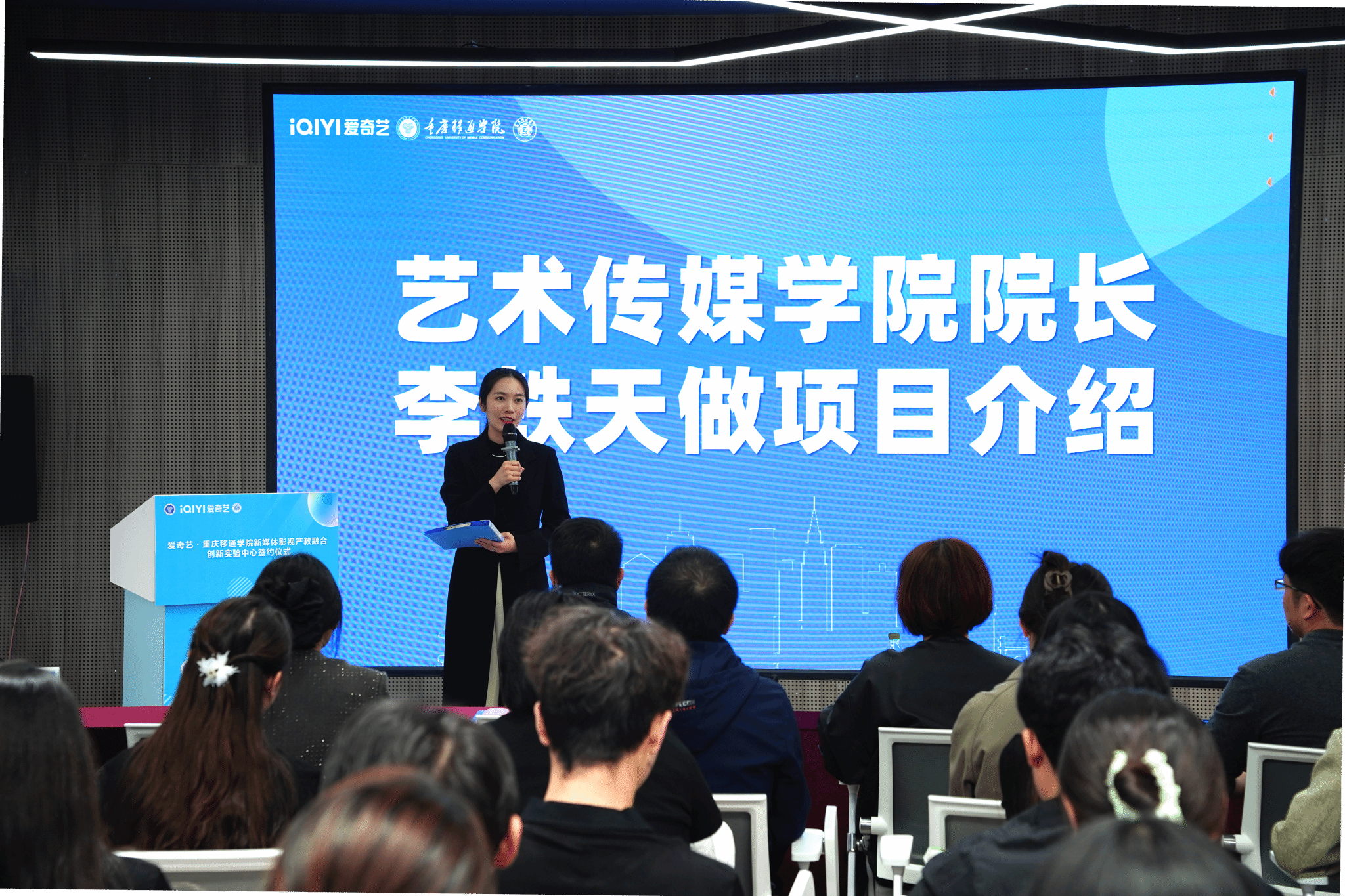 随后,艺术传媒学院院长李轶天对“桃创成长营”定向培养班项目做了详细报告,她提到,“桃创班”每期选拔36人,由学校艺术传媒学院、双体软件精英产业学院和爱奇艺共同授课。考核通过的学生将获得爱奇艺提供的实习机会,实习结束后,表现优异的学生将与爱奇艺及学院签订三方就业协议,确保毕业后顺利就业。并表示该项目旨在通过校企合作,为新媒体影视行业输送具备专业技能与创新能力的专业人才。