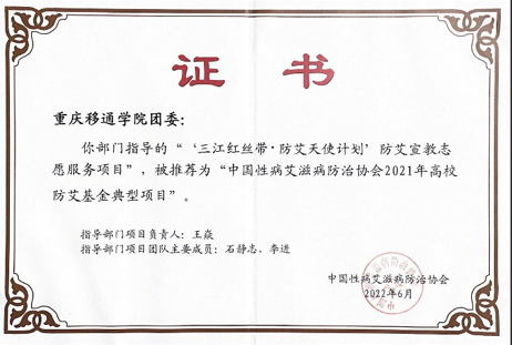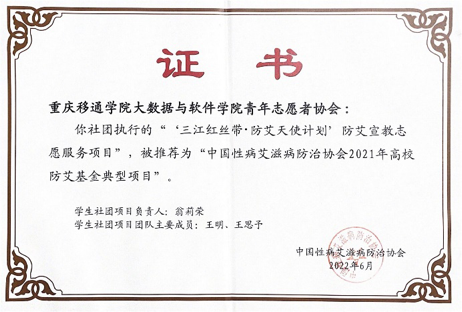 近日,“中国性病艾滋病防治协会2021年高校防艾基金”项目评审结果公布,经中国性病艾滋病防治协会综合项目执行情况,在来自中国疾控中心、中国健康教育中心、北京市疾控中心、北京地坛医院、北京大学儿童青少年卫生研究所等艾滋病防治、健康教育领域的专家参加的验收会上,我校大数据与计算机科学学院青年志愿者协会所执行的“三江红丝带·防艾天使计划”防艾宣教志愿服务项目被推荐为“中国性病艾滋病防治协会2021年高校防艾基金典型项目”,这是该项目第七次获得国家级荣誉。