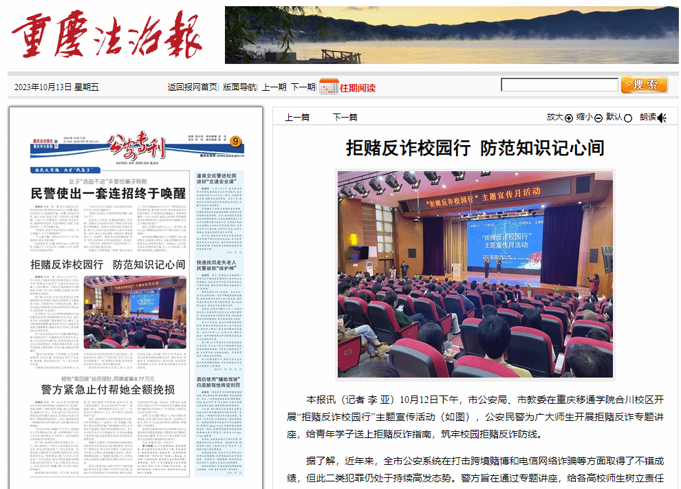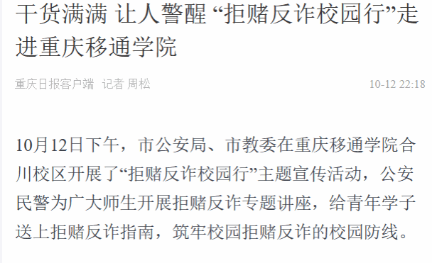 我校“拒赌反诈校园行”主题宣传活动的举办,获得重庆日报、重庆法治报关注报道。