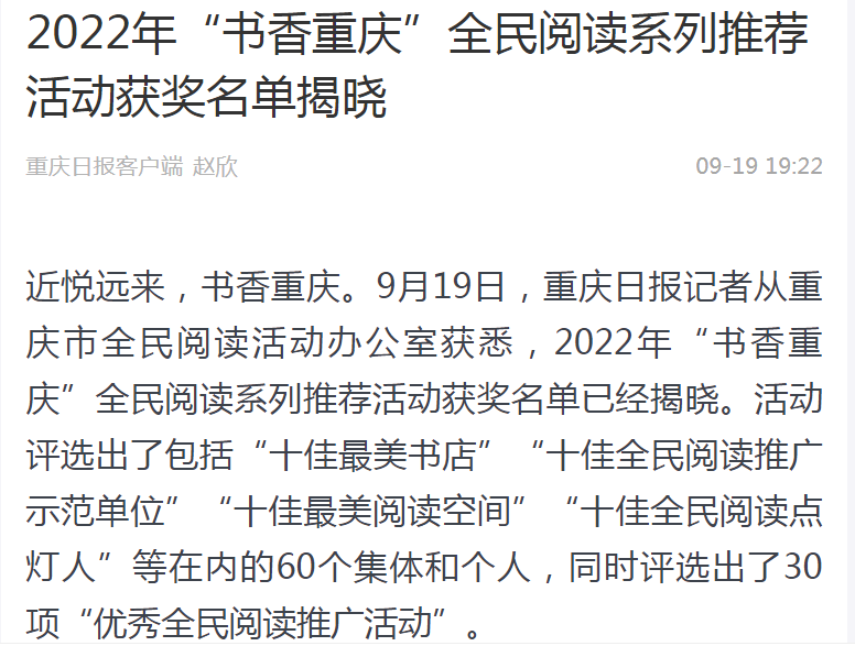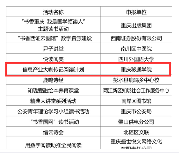 9月19日,2022年“书香重庆”全民阅读系列推荐活动获奖名单已经揭晓,重庆移通学院“信息产业大咖传记阅读计划”榜上有名。