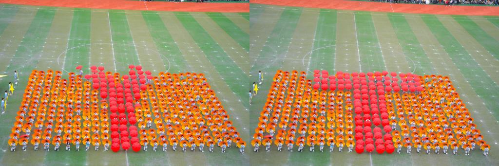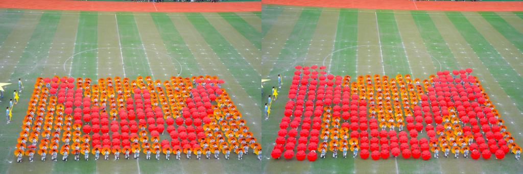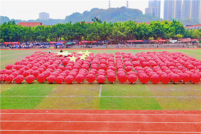 各方阵有序退场后,由淬炼商学院、大数据与软件学院、外国语言文学系带来大型团体操表演《向前冲》,手中的雨伞呈现出红黄色海洋,随着队形的变化,海洋也随之荡漾,醒目的红色箭头,象征着移通学子勇往直前、奋斗不止的精神。校twinkle啦啦操排舞队带来富有浓郁中国风的扇子舞表演,翻飞舞动的扇子抒发着生命的喜悦,舒展大方的动作洋溢着生命的欢快。她们向中间迅速靠拢蹲下,用伞拼成三角形代表着移通学子稳定与进取的坚韧力量,接着依次摆出字母W、M、Y、T,寓意在完满教育理念下的移通学子不断提升、充满希望;巨大的五星红旗,为祖国70周年华诞送去最美好的祝愿,愿祖国繁荣昌盛、更加强大!