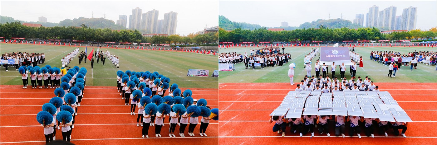 上午8点,开幕式在激越雄壮的运动员进行曲中拉开序幕,各代表队精神抖擞、整齐有序地步入运动场。国旗班庄严肃穆、英姿飒爽;仪仗队奏响明亮的鼓点,谱写青春的乐章;红旗队迈着矫健有力的步伐,昂首阔步地走过主席台;10支教职工方阵、9支院系方阵以整齐的步伐、嘹亮的口号、精彩的入场表演展现着青春活力和院系特色。其中,淬炼商学院方阵手持彩色羽扇,在音乐节奏的变幻下绽放出一朵朵色彩缤纷的“花朵”,如同多姿多彩的“完满之花”,寓意着希望和憧憬;大数据与软件学院方阵举起“商科教育、完满教育、通识教育、专业教育”四面旗帜,致敬学校“四位一体”人才培养模式;艺术传媒学院学子头戴小黄帽带来了活力满满的舞蹈,洋溢着青春风采……各具特色的表演充分展现出我校师生积极向上的精神风貌和蓬勃昂扬的校园文化。