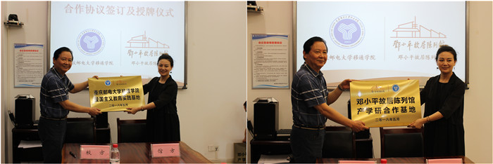 随后,张德民院长与何青副馆长签订了合作协议,并授予邓小平故居陈列馆“重庆邮电大学移通学院爱国主义教育实践基地”牌匾。何青副馆长授予我校“邓小平故居陈列馆产学研合作基地”牌匾。