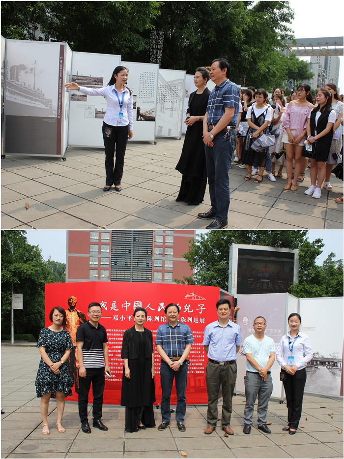 合作协议签订后,在何馆长的陪同下,张院长、苏书记来到教学楼广场,兴致勃勃地参观了“小平风范,文化校园——邓小平故居陈列馆基本陈列巡展”大型展览活动,四星级讲解员刘秀中为大家解读了众多图片背后不同寻常的故事,使大家对这段历史有了更直观、更深刻的理解。