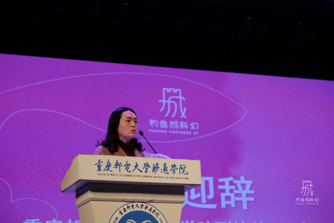 成立仪式上,我校副校长王征致欢迎辞。她首先向莅临指导的各位教授作家、老师同学们表示热烈欢迎。她谈到,在移动互联和人工智能的全面发展的当下,教育的核心要义要回归对人的培养和关注。钓鱼城科幻中心是学校重要的创新平台,立足校园科幻教育,举办国际一流的科幻大奖和面向社会的创意写作工坊,为中国科幻事业培养创新力量,打造完全公益性、高度国际化的亚洲最大科幻中心。她表示,之所以建立大奖与成立科幻社,是因为学校始终把科幻作为一种有价值的学习资源和教育教学的载体,利用科幻的特点为学生提供学习和展示的平台。王校长传达出对钓鱼城科幻大奖和钓鱼城科幻社未来发展的美好期盼与鼓励,她希望大家能够积极参与到这场年轻的科幻的浪潮中,去逐梦踏浪。
