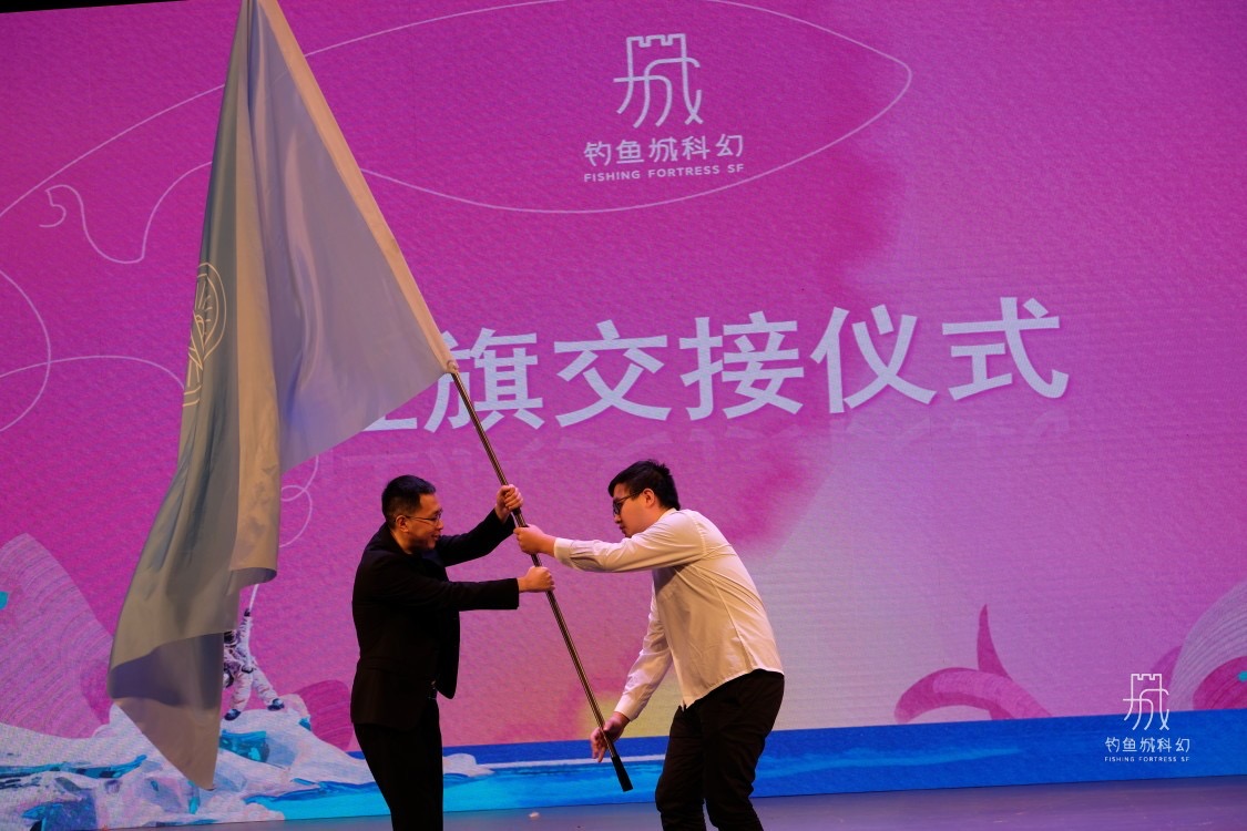 团委副书记谢银平宣读《重庆邮电大学移通学院科幻社成立文件》,宣布我校钓鱼城科幻社正式成立。我校钓鱼城科幻中心主任张凡与钓鱼城科幻社社长何育航进行了社旗交接仪式。