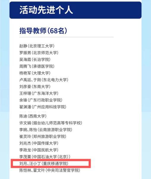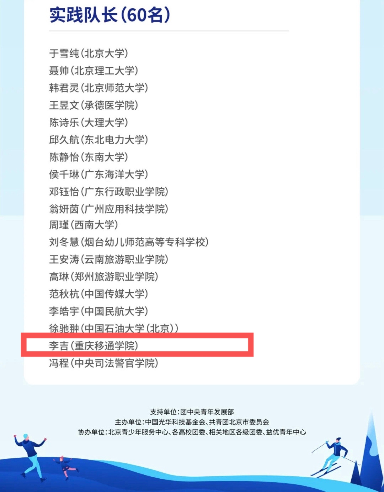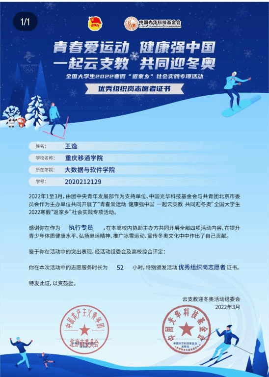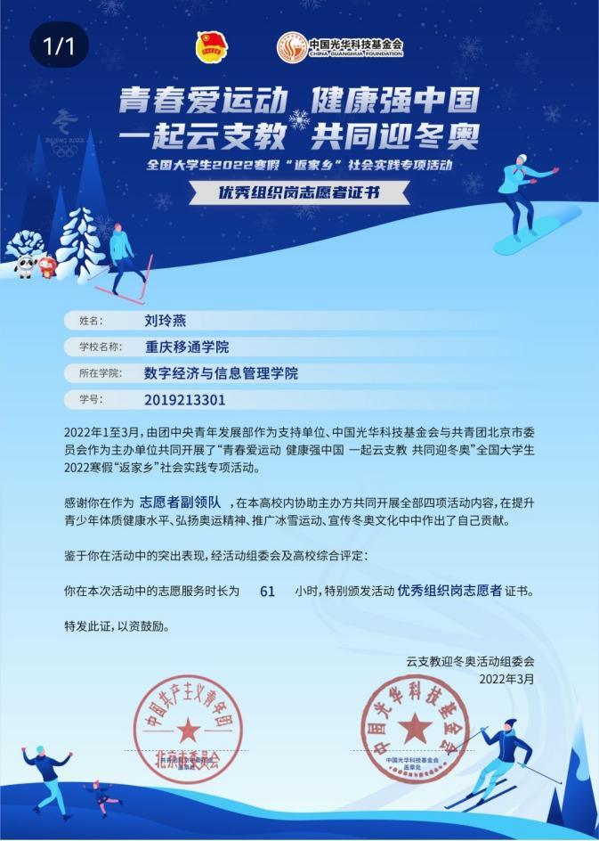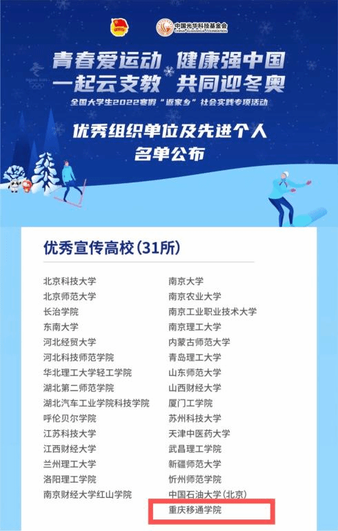 4月20日,由团中央青年发展部作为支持单位,中国光华科技基金会与共青团北京市委员会联合主办的“青春爱运动 健康强中国 一起云支教 共同迎冬奥”全国大学生2022年寒假“返家乡”社会实践专项活动于3月底完美落幕。经“一起云支教”工作组评选和领导单位审定,重庆移通学院在220余所高校中脱颖而出,荣获优秀宣传高校,团委刘月和汪小丁老师被评为活动先进个人指导老师,李吉同学被评为活动先进个人实践队长,刘玲燕、朱喆、王逸等12名同学被评为优秀组织岗位志愿者,赵曾荣、全丽等13 名同学被评为优秀志愿者。